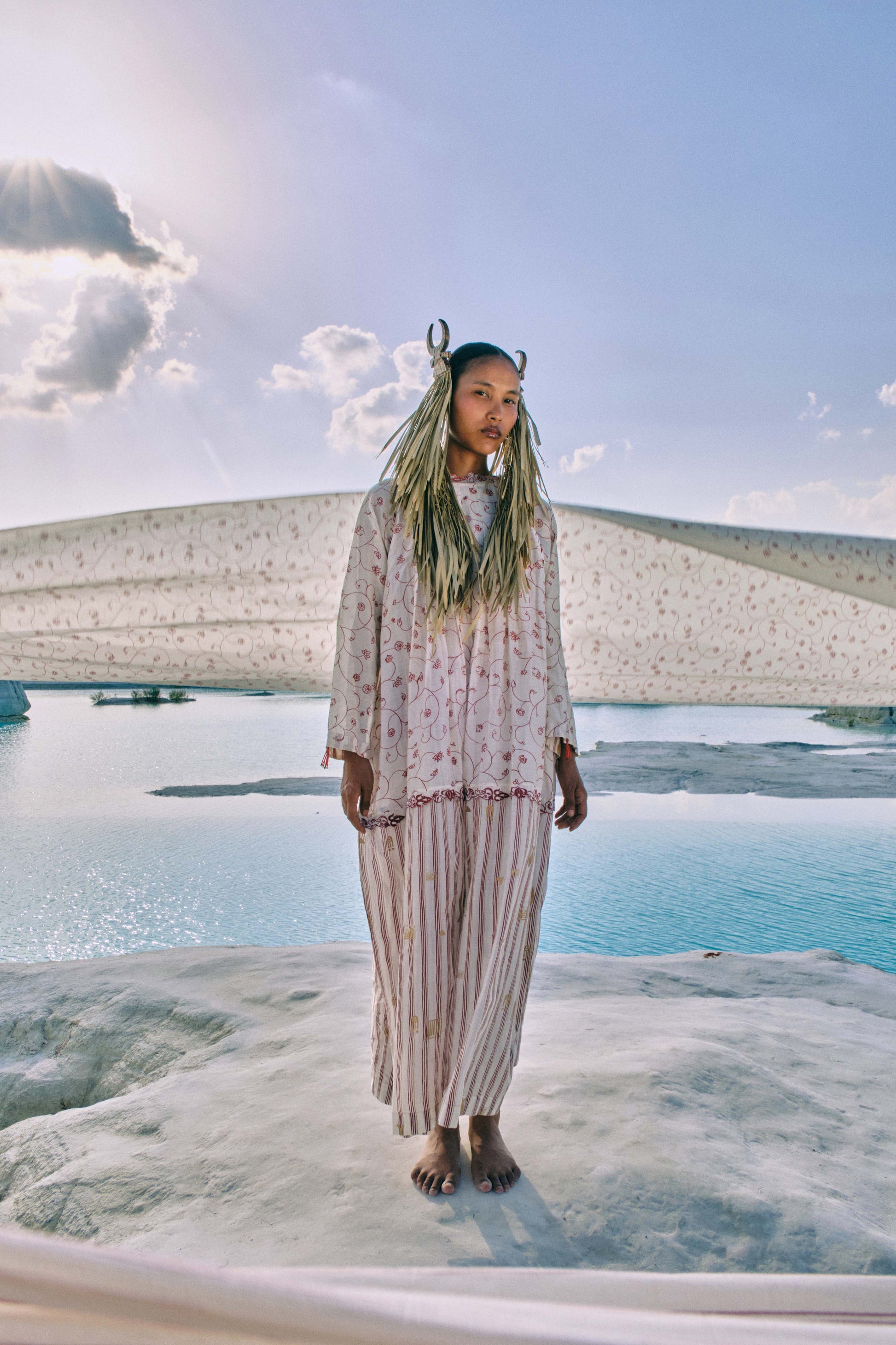 A study in structure and craftsmanship, the Chan Box Pleat Dress is crafted in contrasting hand-screen-printed cotton silk. Box pleats at the yoke and embroidered lace at the neckline lend sophistication, while raglan sleeves with bias binding create soft structure. A back tie-up adorned with handmade beaded tassels adds a delicate flourish. Every pleat, stitch, and embellishment reflects hours of meticulous labour, creating a piece where artistry and elegance flow in perfect harmony.