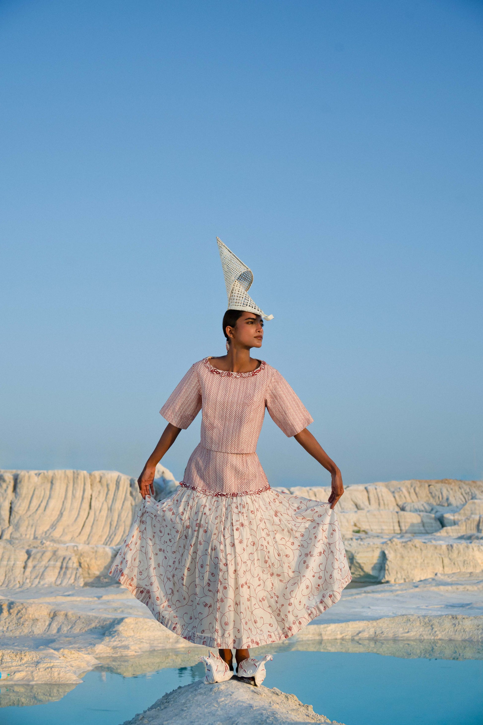 The Hnin Quilted Skirt is a study in contrast and texture—half quilted, half hand-screen-printed, panelled with delicate bindings and subtle red dotted stitching. Designed to fit smoothly from waist to hip, it sculpts the body elegantly, with a drawstring and side zipper for ease. Hand and machine embroidery add artisanal detail, resulting in a silhouette that marries structure, comfort, and grace. Each element has been executed with meticulous labour, reflecting the hours of craftsmanship invested into its creation.