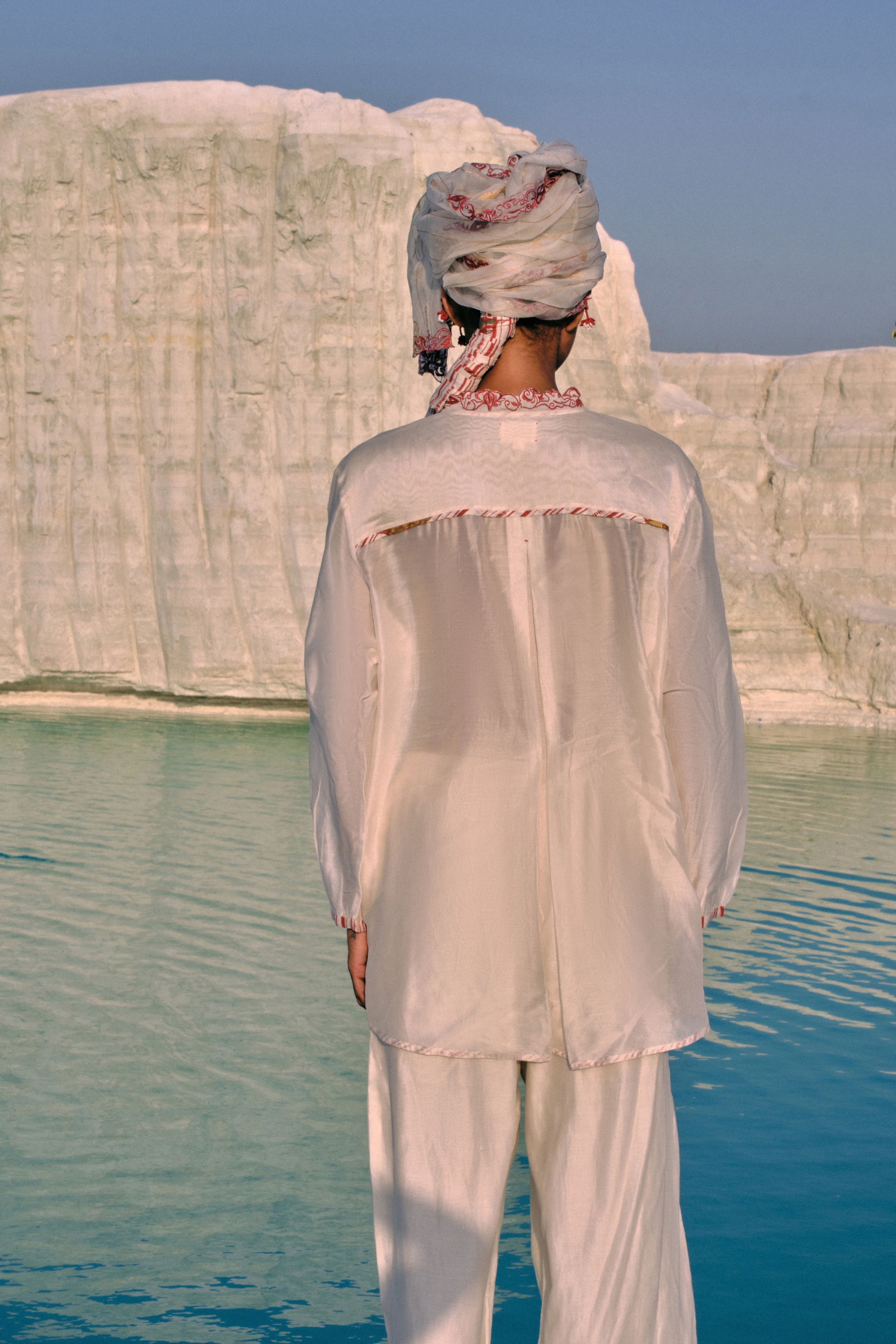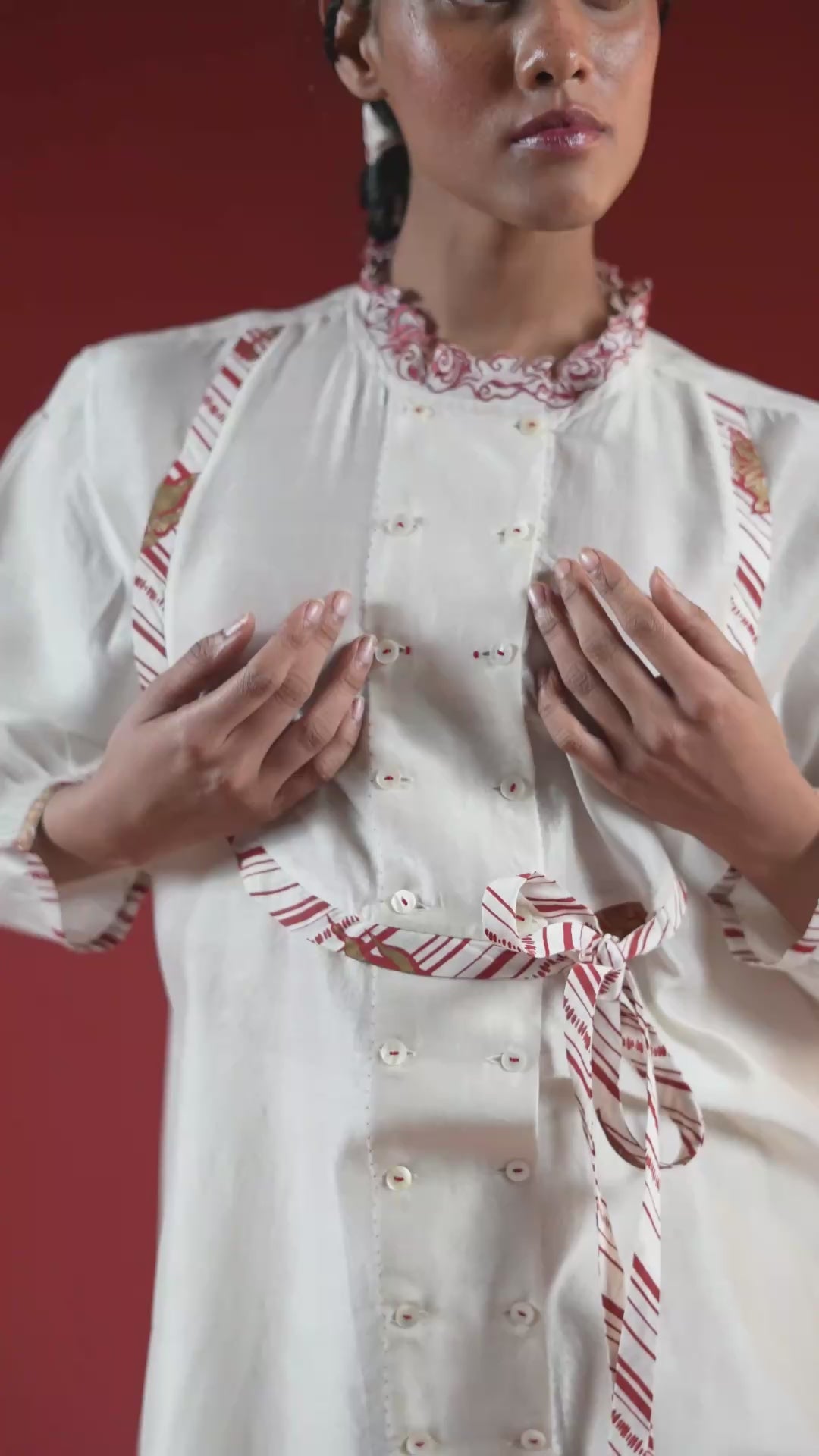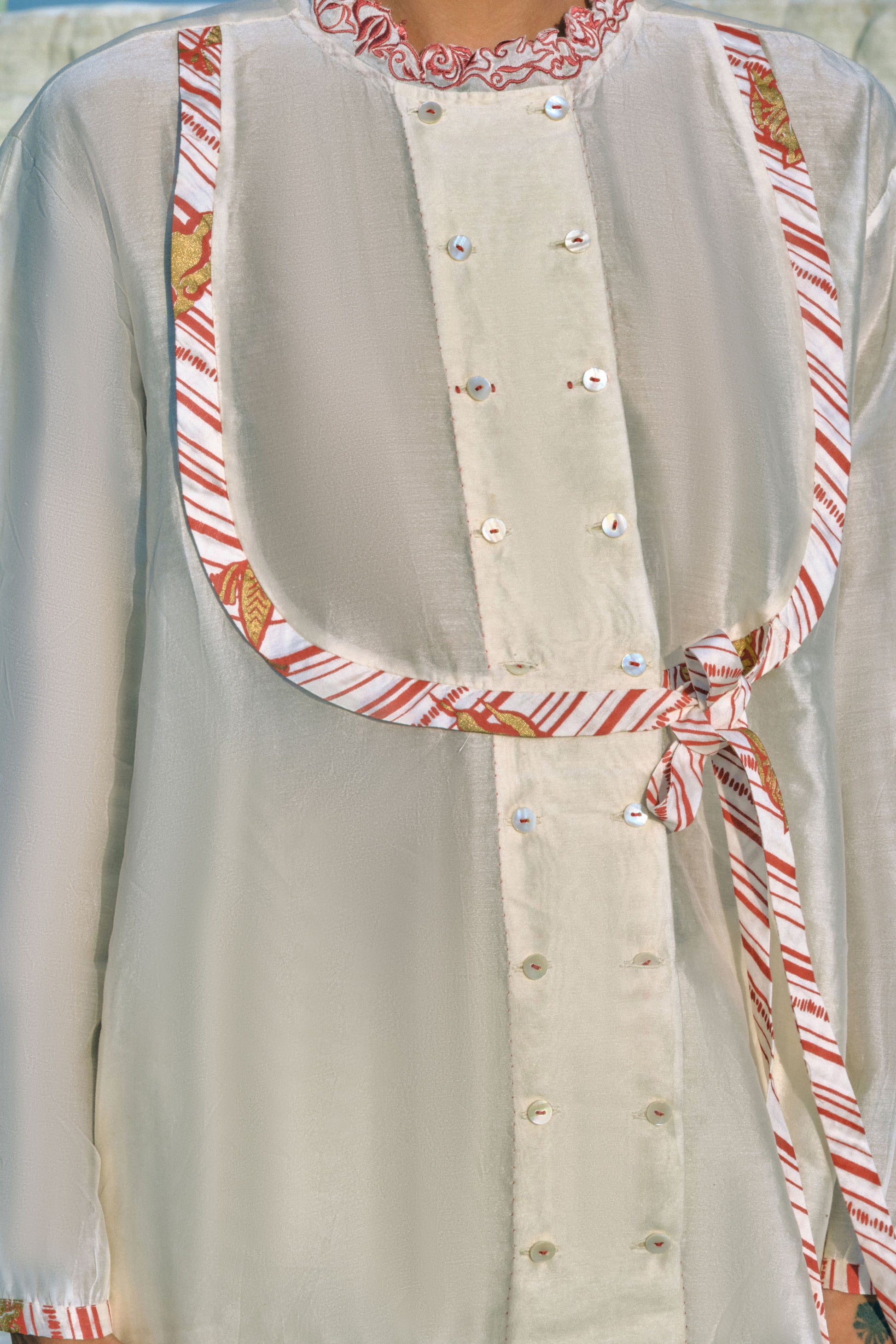 The Thida Mandarin Shirt merges structure and softness, crafted in plain cotton silk with a hand-embroidered collar. A front yoke with delicate tie-ups and a soft box pleat at the back allows graceful movement. Every detail reflects hours of meticulous handwork, making it a piece that embodies quiet confidence, artisanal craftsmanship, and enduring elegance.