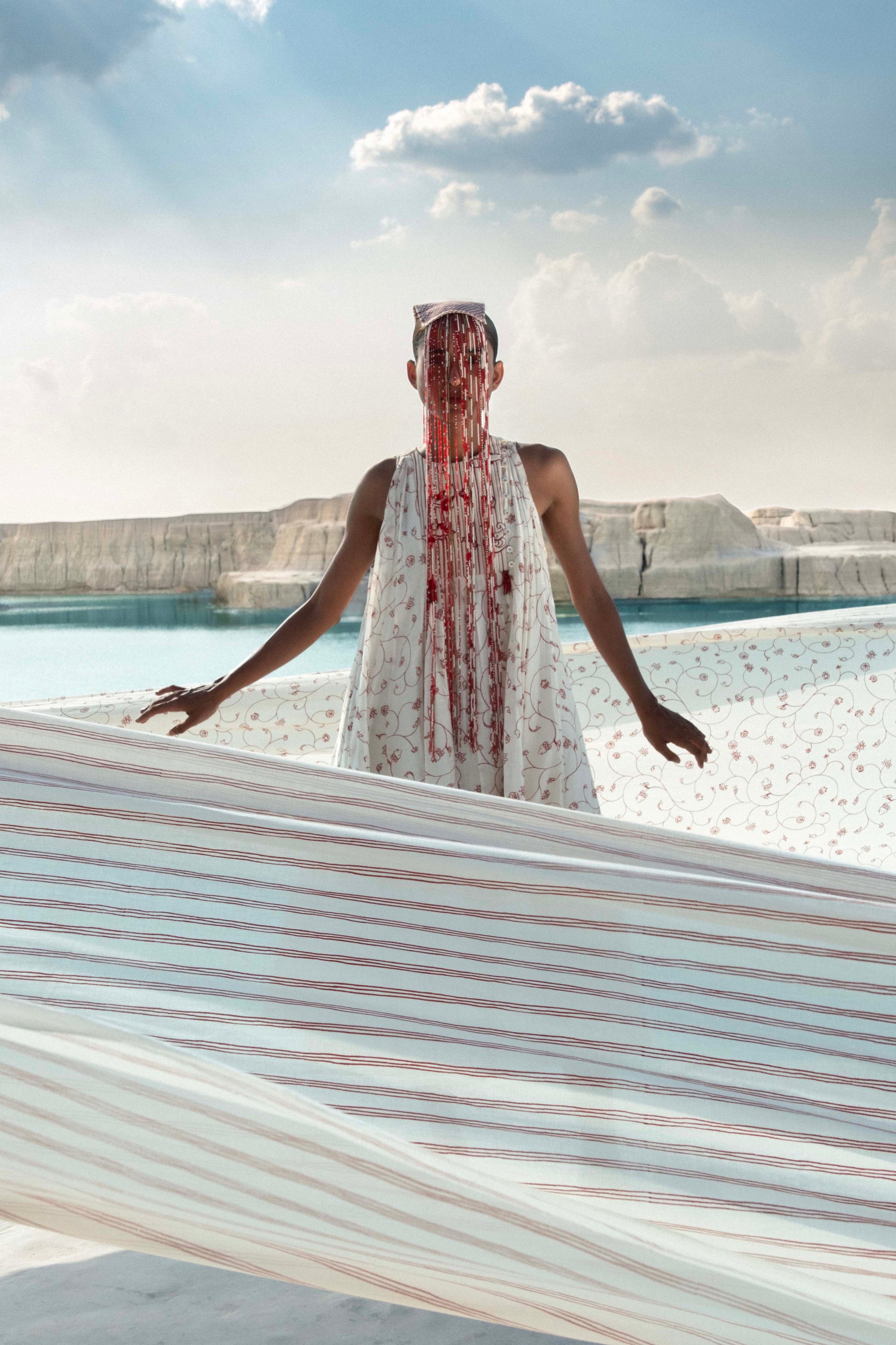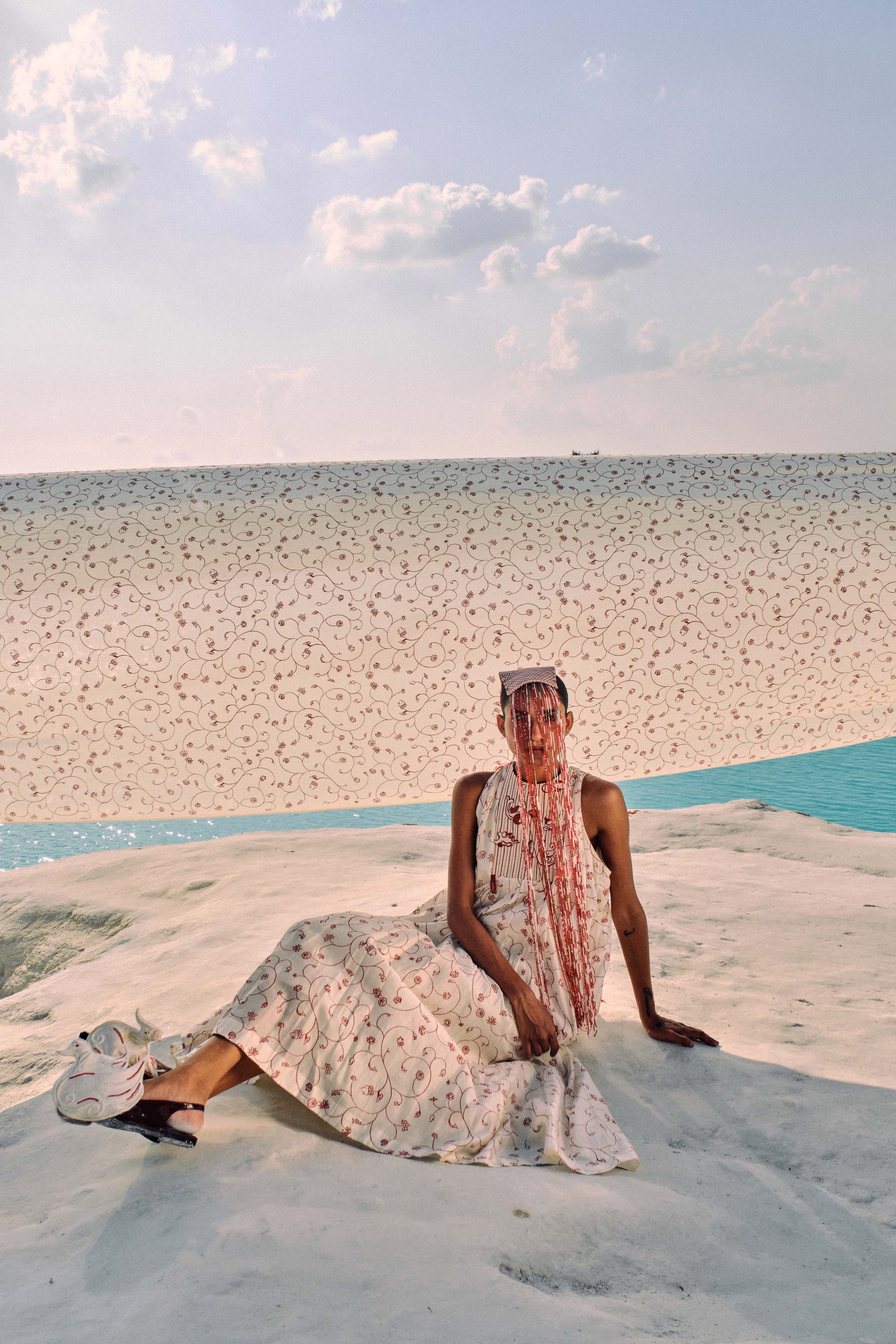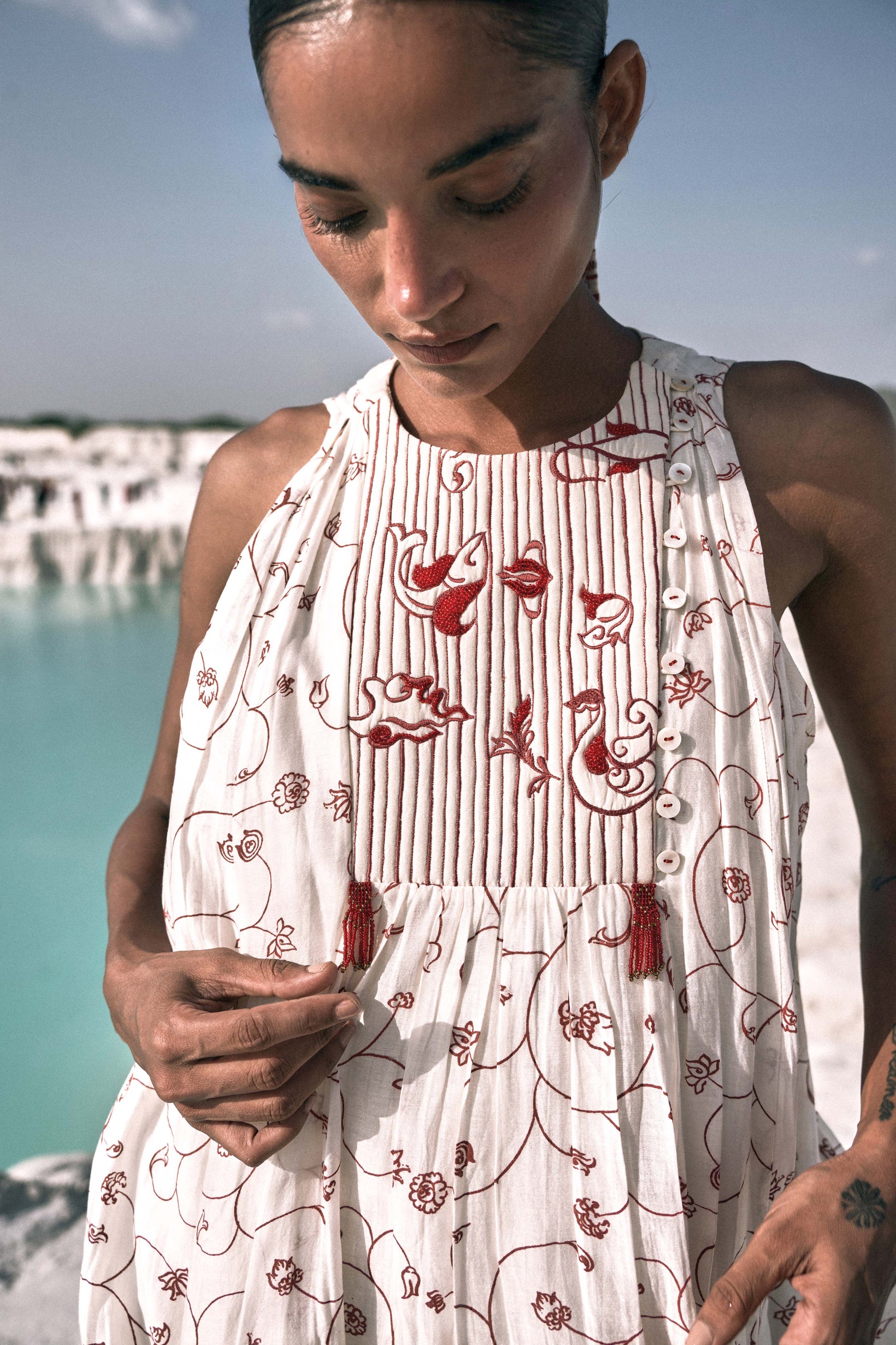 The Yadana Halter Dress, made in hand-screen-printed cotton silk, celebrates thoughtful design and effortless elegance. A quilted yoke with subtle hand-beaded accents anchors the silhouette, while soft godets and gathers allow the fabric to cascade fluidly over the body. This versatile dress combines artistry, comfort, and timeless sophistication, perfect for understated occasions.