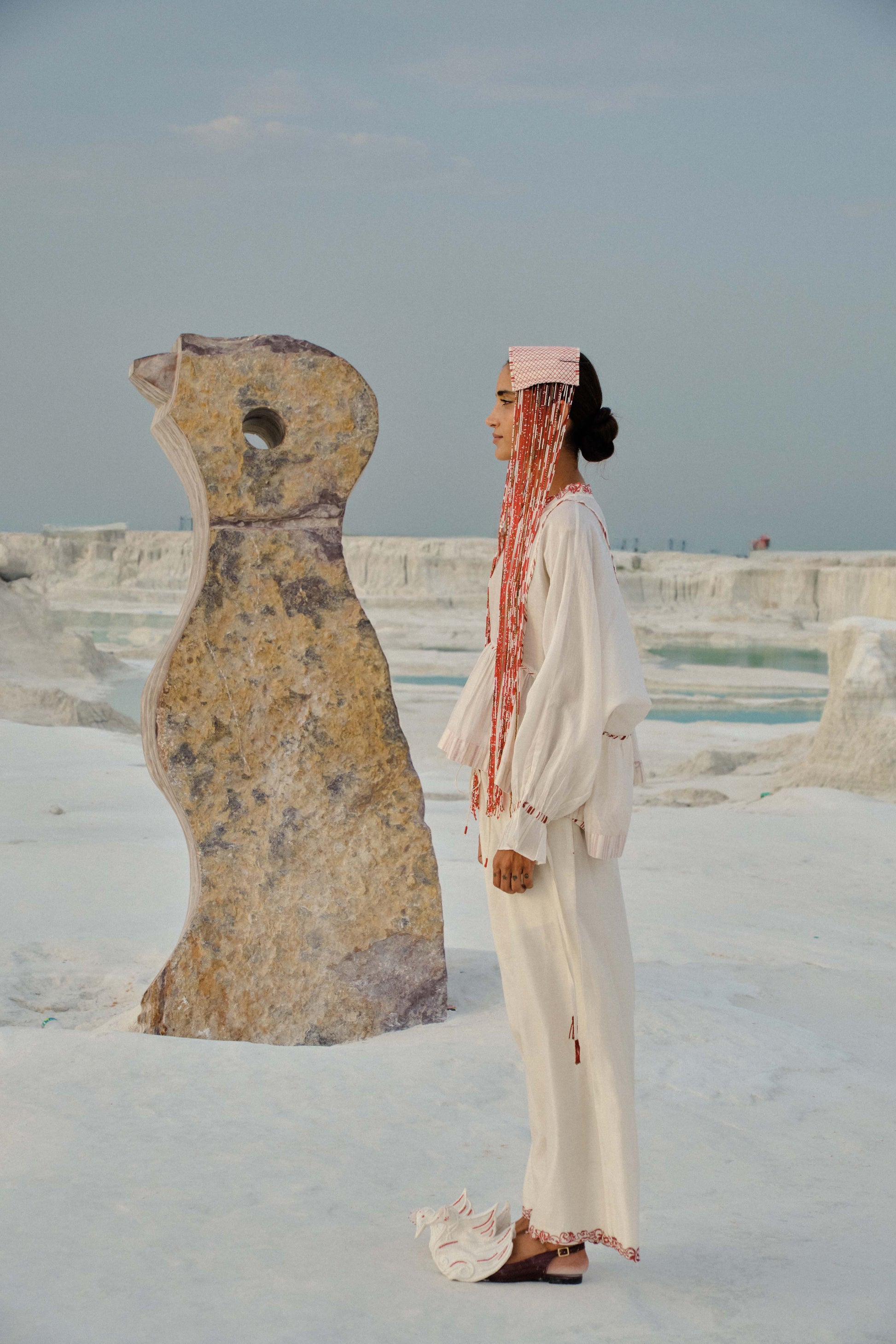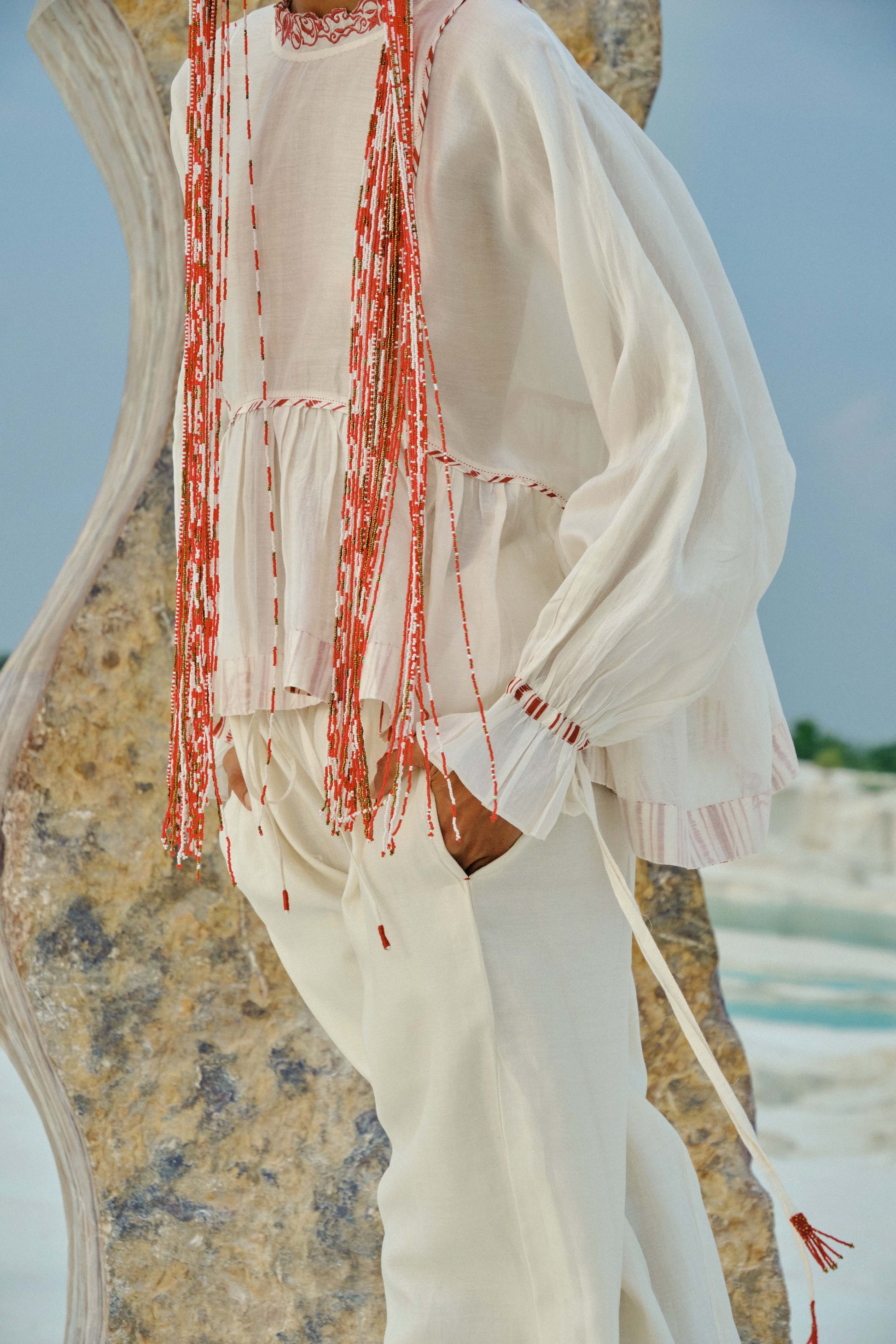 Crafted in soft, plain cotton-silk, this dolman top flows effortlessly over the body, offering a relaxed yet refined silhouette. The embroidered neckline is a subtle celebration of craftsmanship, while the panelled yoke and delicate binding trace the contours of the front and back. Gathered flares add movement, and the tie-up sleeves, adorned with handmade tassels, bring a touch of playful sophistication. Every element has been created with painstaking care, reflecting hours of meticulous artisanal labour.