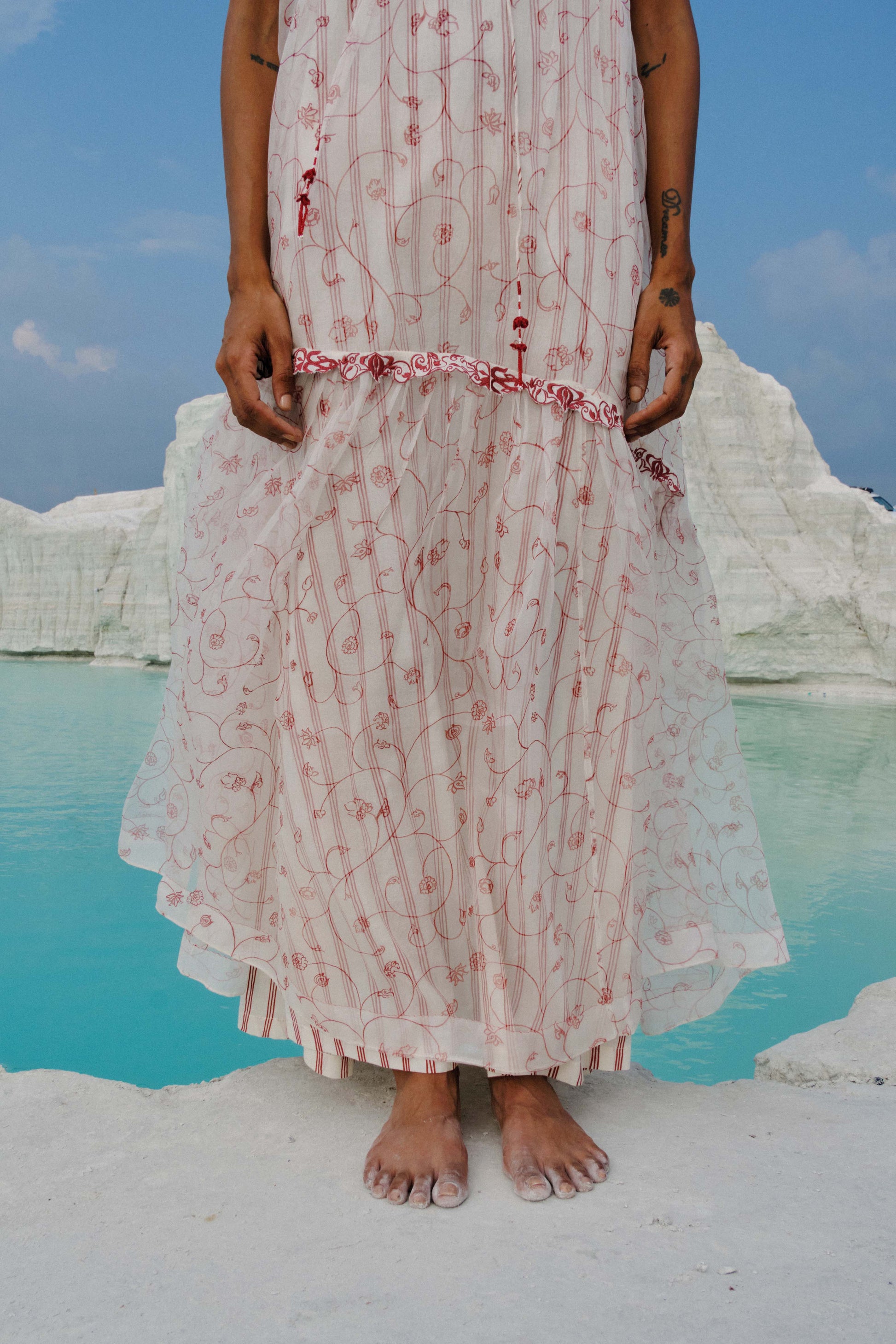 The Ei Mon Organza Tier Dress is a three-tiered masterpiece of hand-screen-printed organza. Delicate gathers and intricate embroidered lace detailing run throughout, while front tie-ups finished with handmade beaded tassels ensure a customizable fit. The layered tiers cascade gracefully, creating an airy, ethereal drape over the body. Each stitch, tassel, and embroidered detail reflects hours of meticulous craftsmanship, making this dress a celebration of femininity, comfort, and refined artistry.