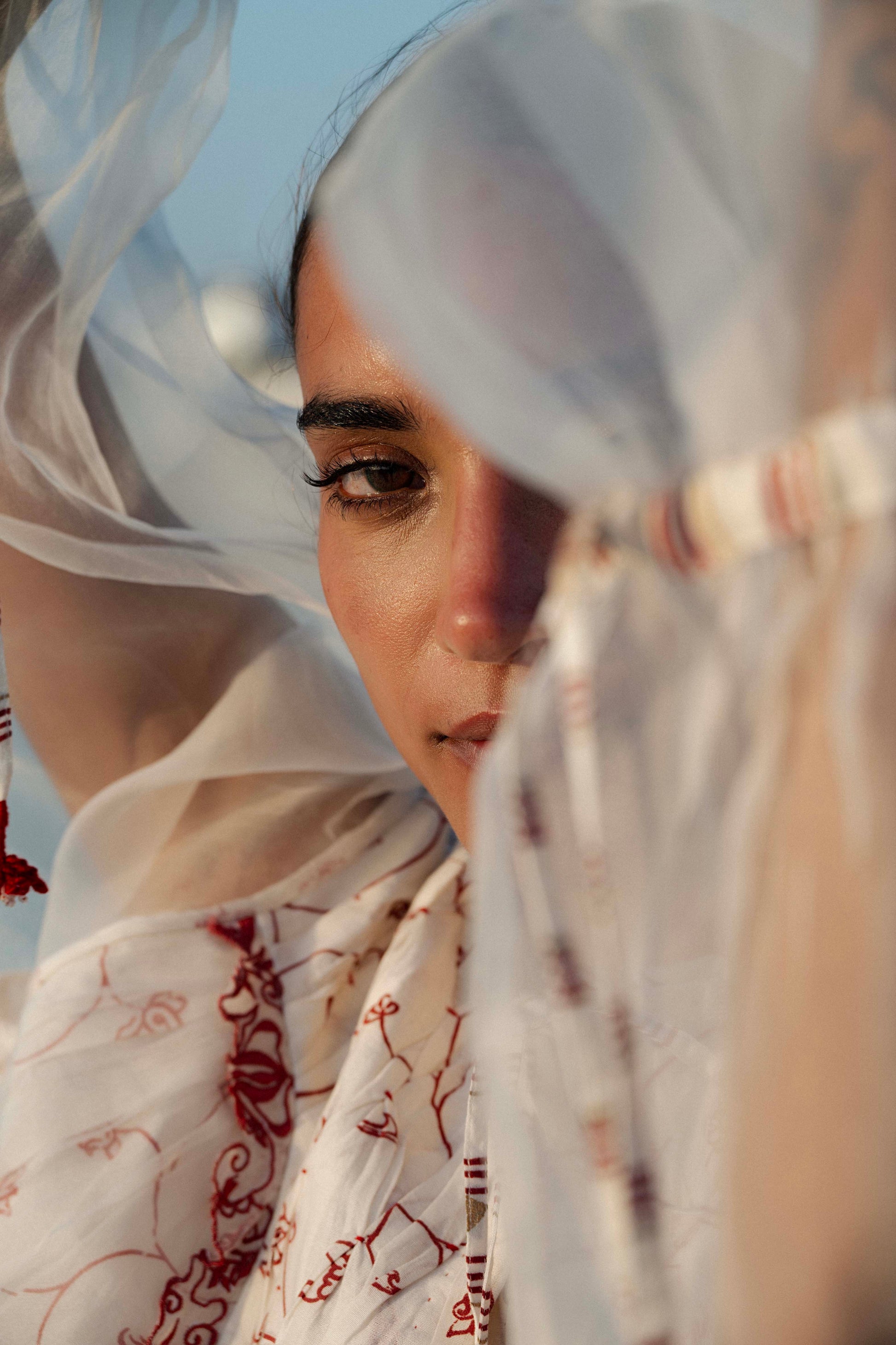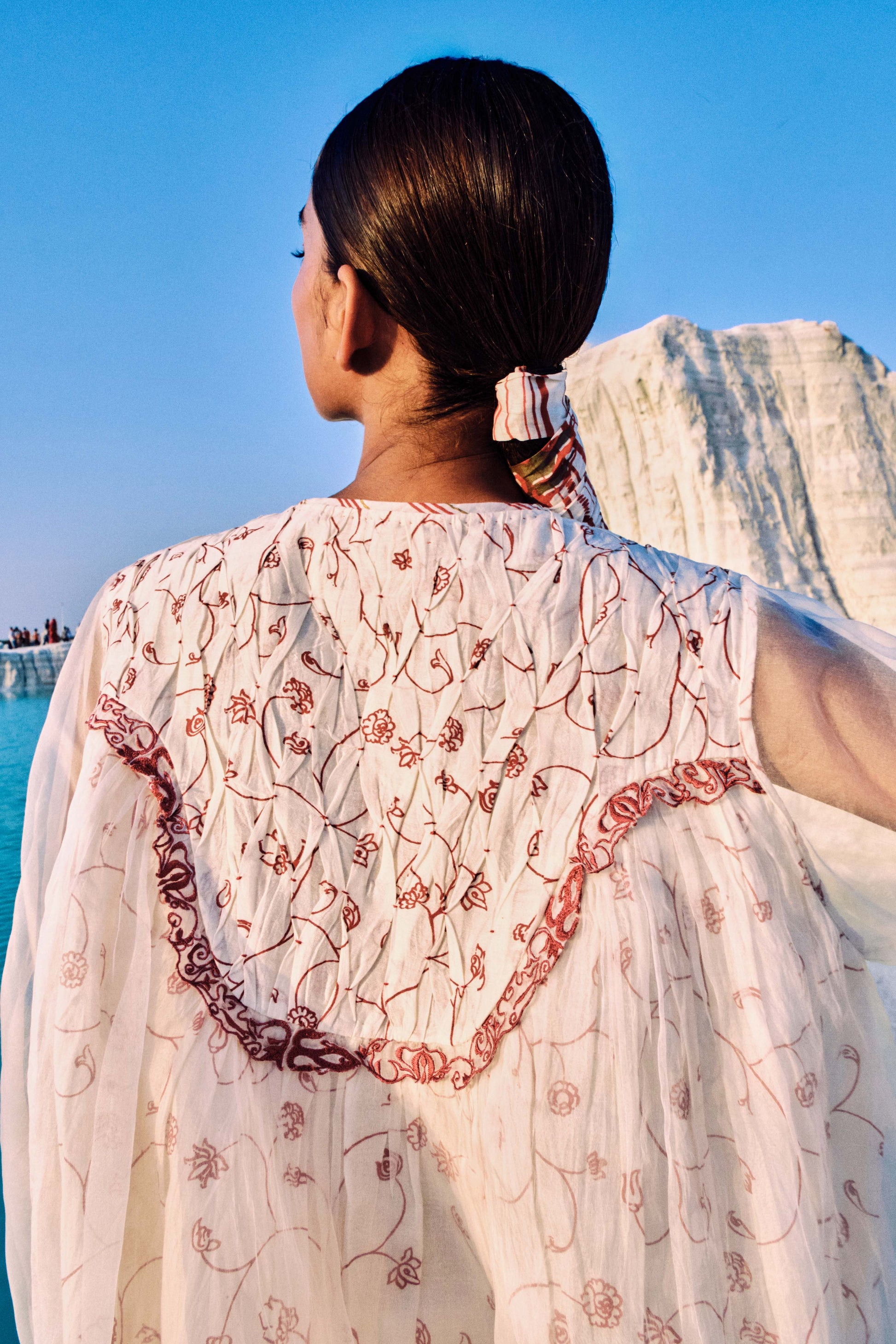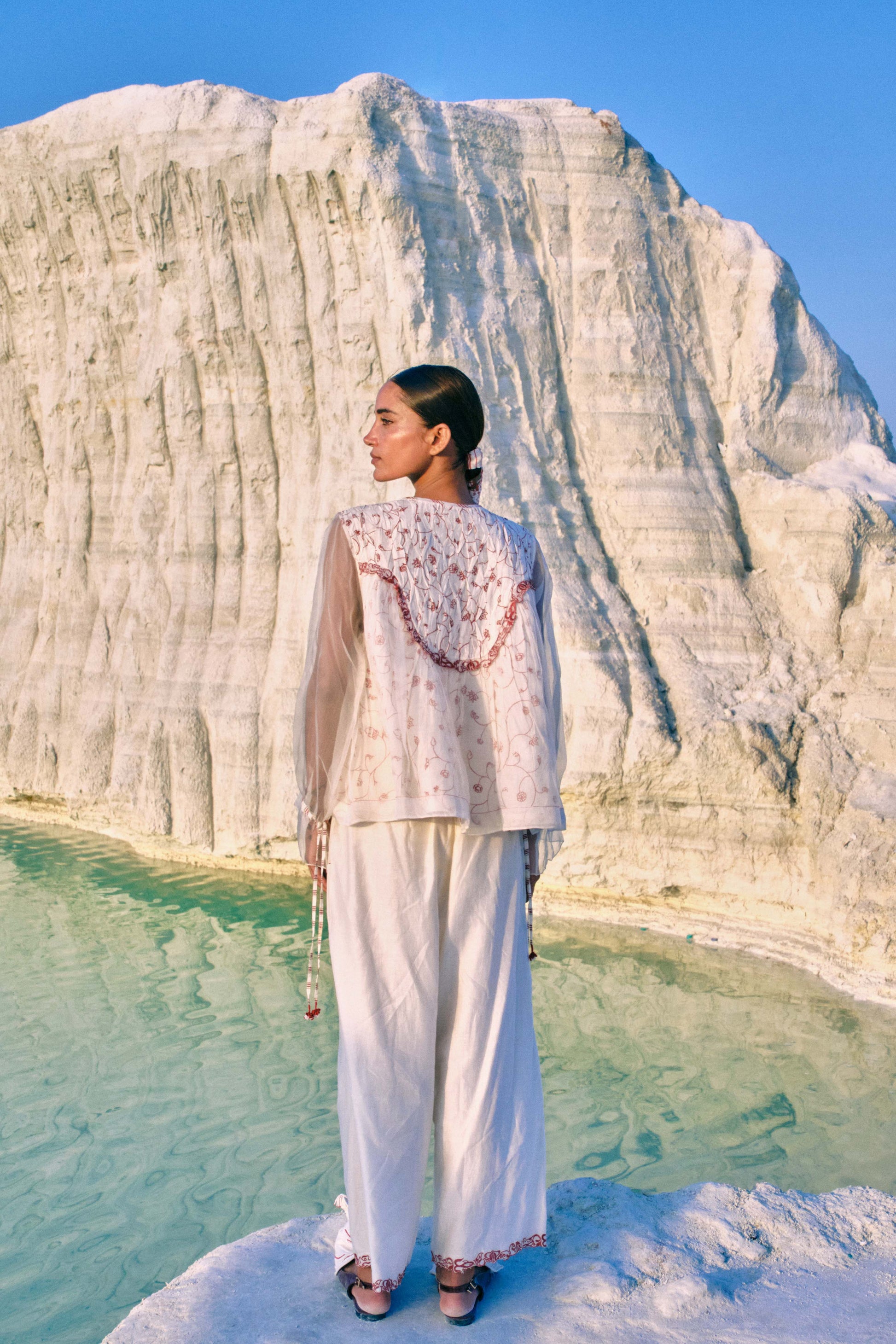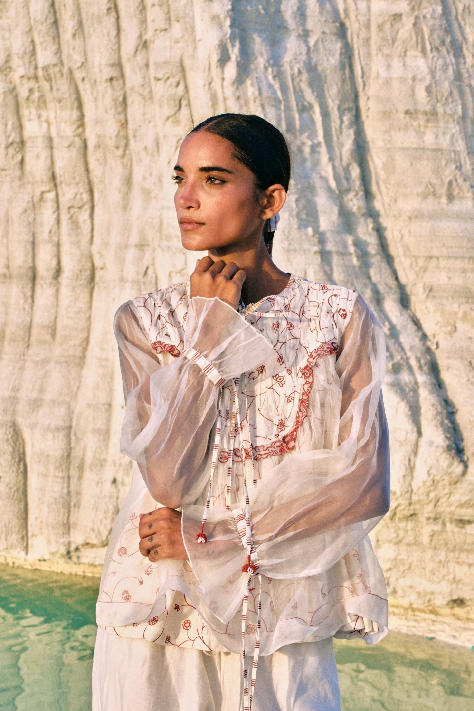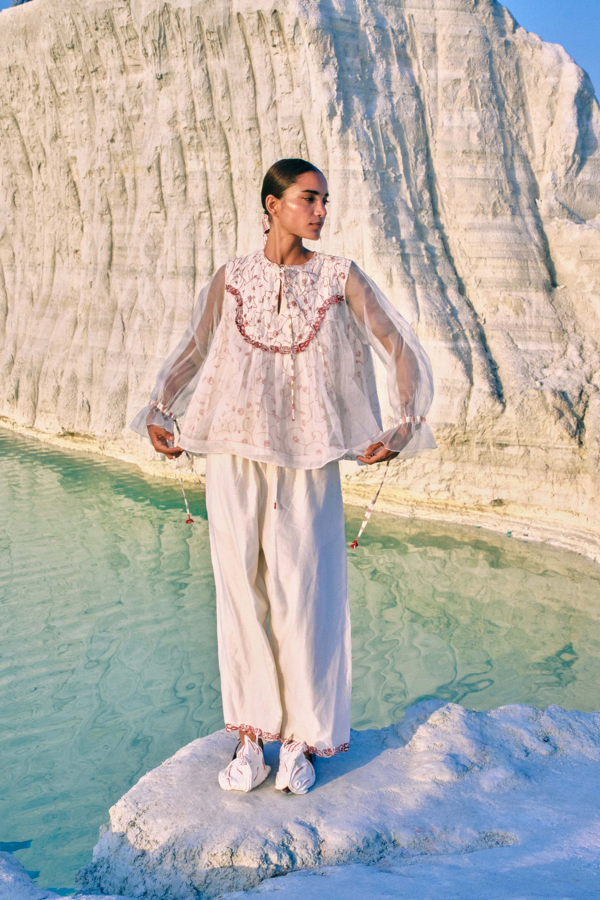The Khin Yoke Top is a study in refined artistry. Intricate smocking adorns the yoke, while delicate bindings trace the neckline and front opening, accented with tie-ups finished with handmade tassels. Sheer organza sleeves echo this elegance, finished with playful tie-ups. Flowing into a soft, flattering silhouette, the top drapes effortlessly, seamlessly transitioning from day to evening. Every stitch and embellishment has been executed with meticulous care, reflecting hours of labour and artisanal skill.