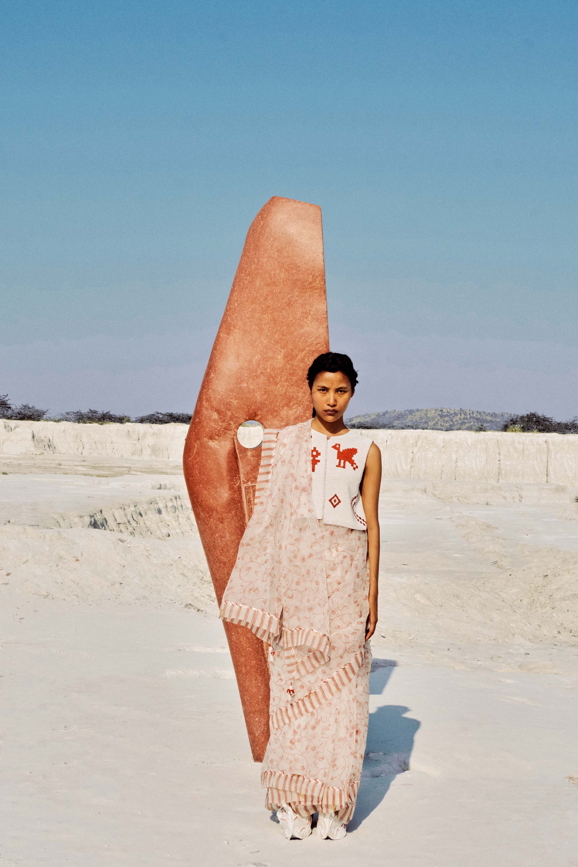 The Liz Organza Saree, crafted from hand-screen-printed silk organza, is a study in lightness and refined artistry. Intricate lace runs throughout its length, while handmade beaded tassels lend delicate, shimmering accents. Binding details trace the borders, adding subtle structure to the flowing fabric. Each lace motif, stitch, and tassel has been executed with hours of careful labour, making this saree a timeless embodiment of sophistication, grace, and artisanal mastery.