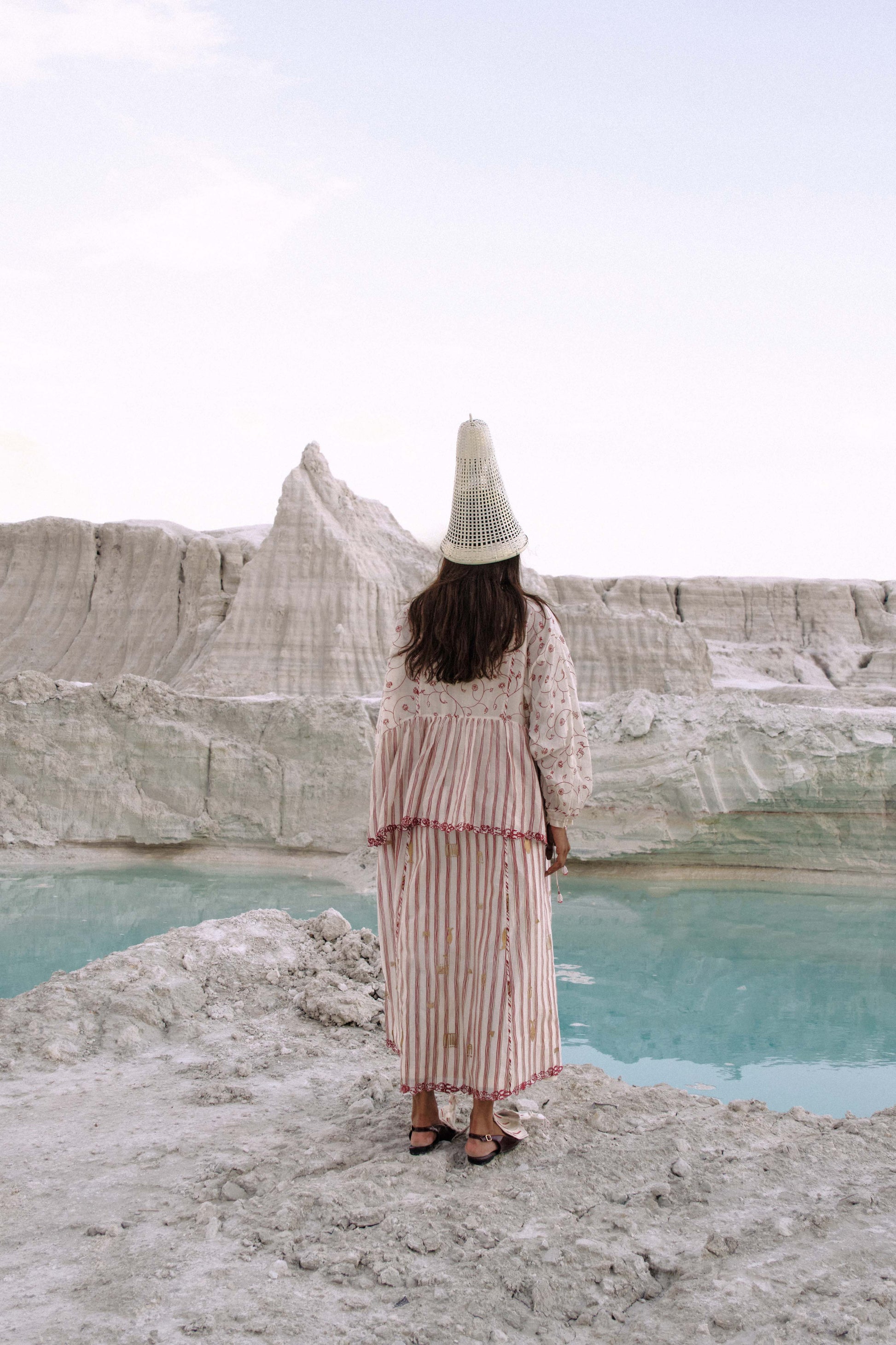 A two-tiered dress in hand-screen-printed cotton silk, the Hintha Gathered Dress combines delicate artistry with effortless movement. The embroidered hem and dolman sleeves with tie-ups are an artisanal charm. Soft tiers drape gracefully over the body, accentuating a fluid, airy silhouette. Hours of careful labour and intricate detailing render this dress a piece of refined craftsmanship, perfect for a day-to-evening transition.