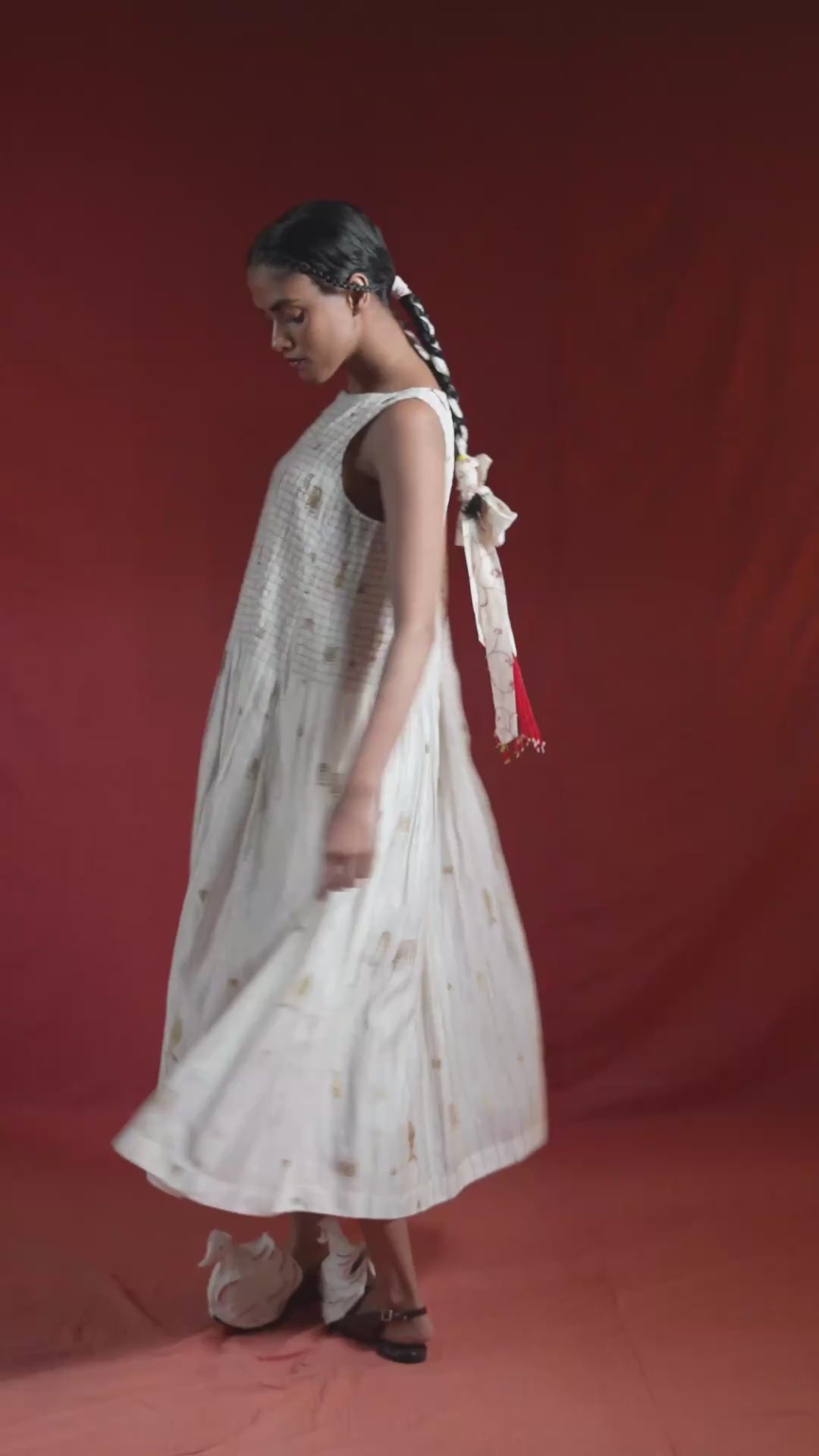 The Lay Ruching Dress, made from hand-screen-printed cotton silk, combines sophistication with ease. Subtle ruching in red thread adds playful movement, while the back button keyhole and side pockets balance practicality with elegance. The soft silhouette drapes fluidly over the body, creating a refined yet breezy form. Each detail has been crafted with meticulous care and hours of skilled artisan labour, resulting in a dress that merges comfort, artistry, and timeless charm.