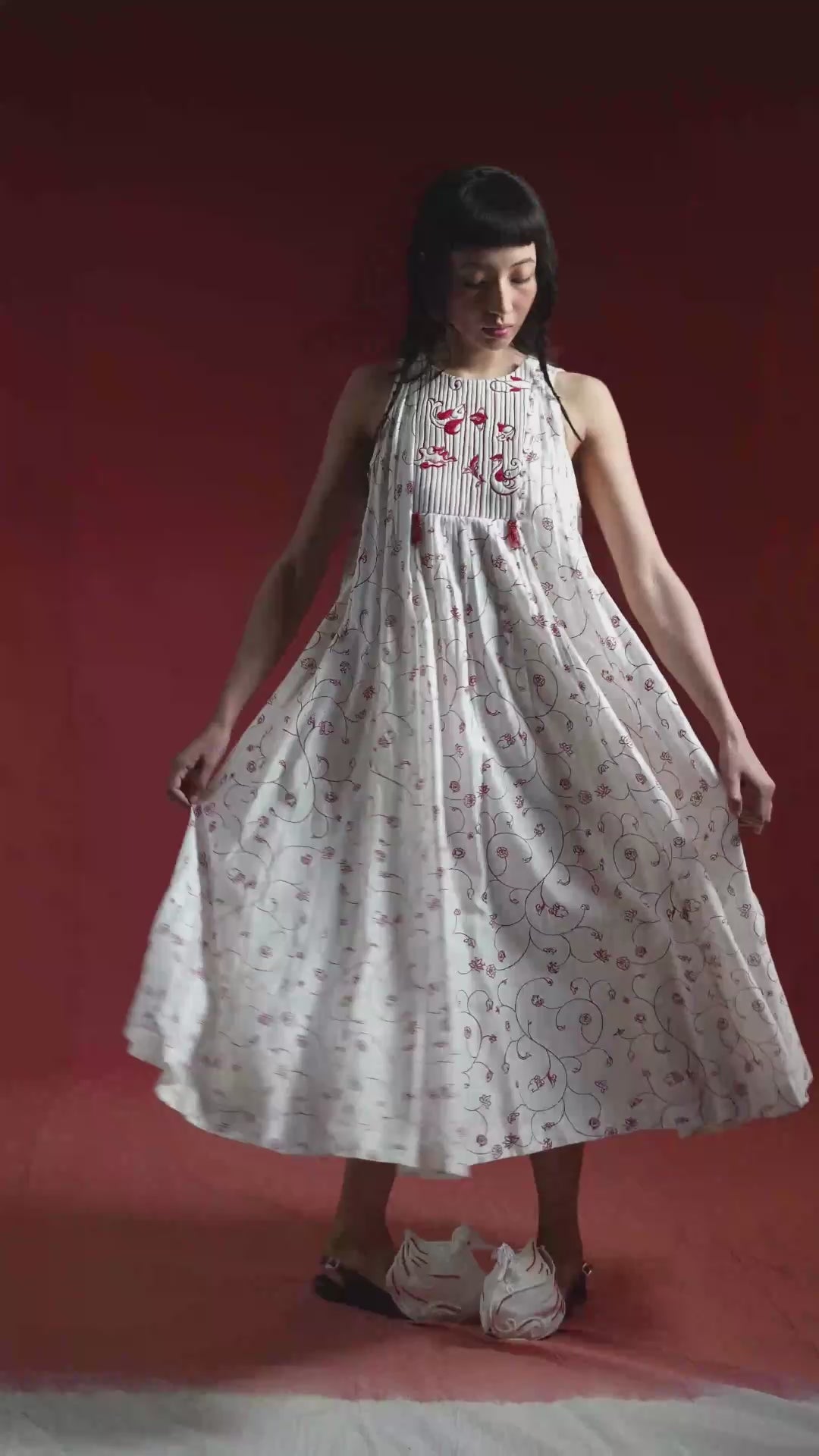 The Yadana Halter Dress, made in hand-screen-printed cotton silk, celebrates thoughtful design and effortless elegance. A quilted yoke with subtle hand-beaded accents anchors the silhouette, while soft godets and gathers allow the fabric to cascade fluidly over the body. This versatile dress combines artistry, comfort, and timeless sophistication, perfect for understated occasions.