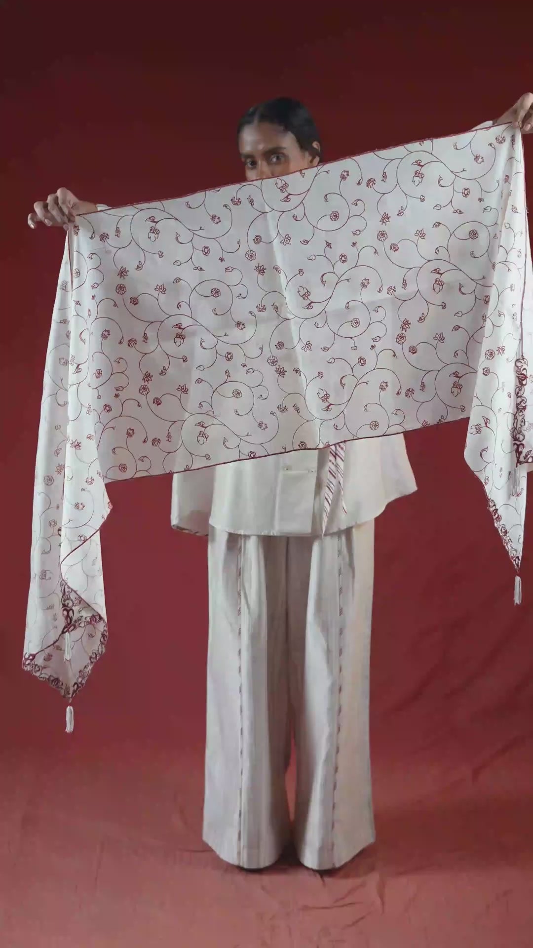 Crafted from hand-screen-printed cotton silk, the Ithaa Cotton Silk Scarf is an elegant accessory with thoughtful artisanal details. The edges are finished with hand embroidery and handmade beaded tassels, creating a delicate and textured finish. Lightweight and airy, it drapes naturally over the body, offering effortless style. Every stitch, tassel, and embroidered detail has been executed with hours of careful labour, transforming this scarf into an accessory that celebrates meticulous craftsmanship and refined elegance.