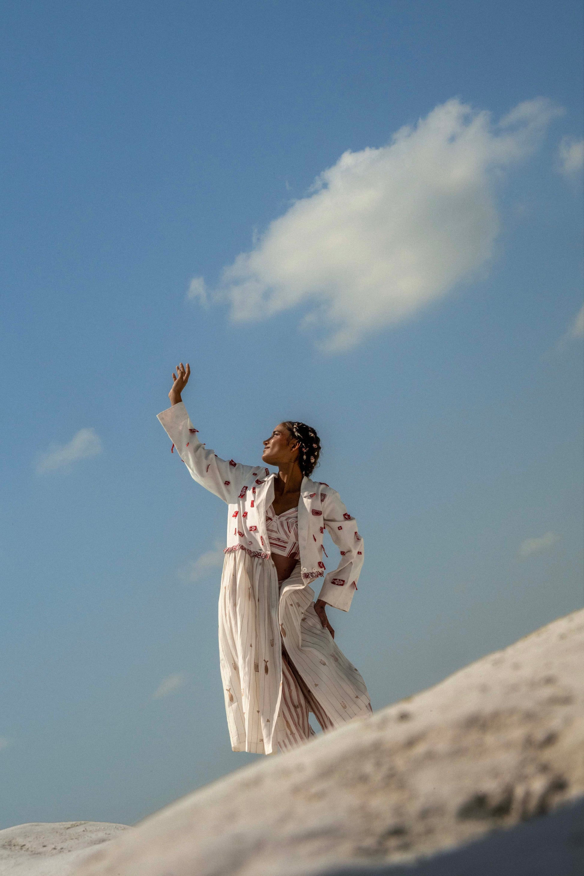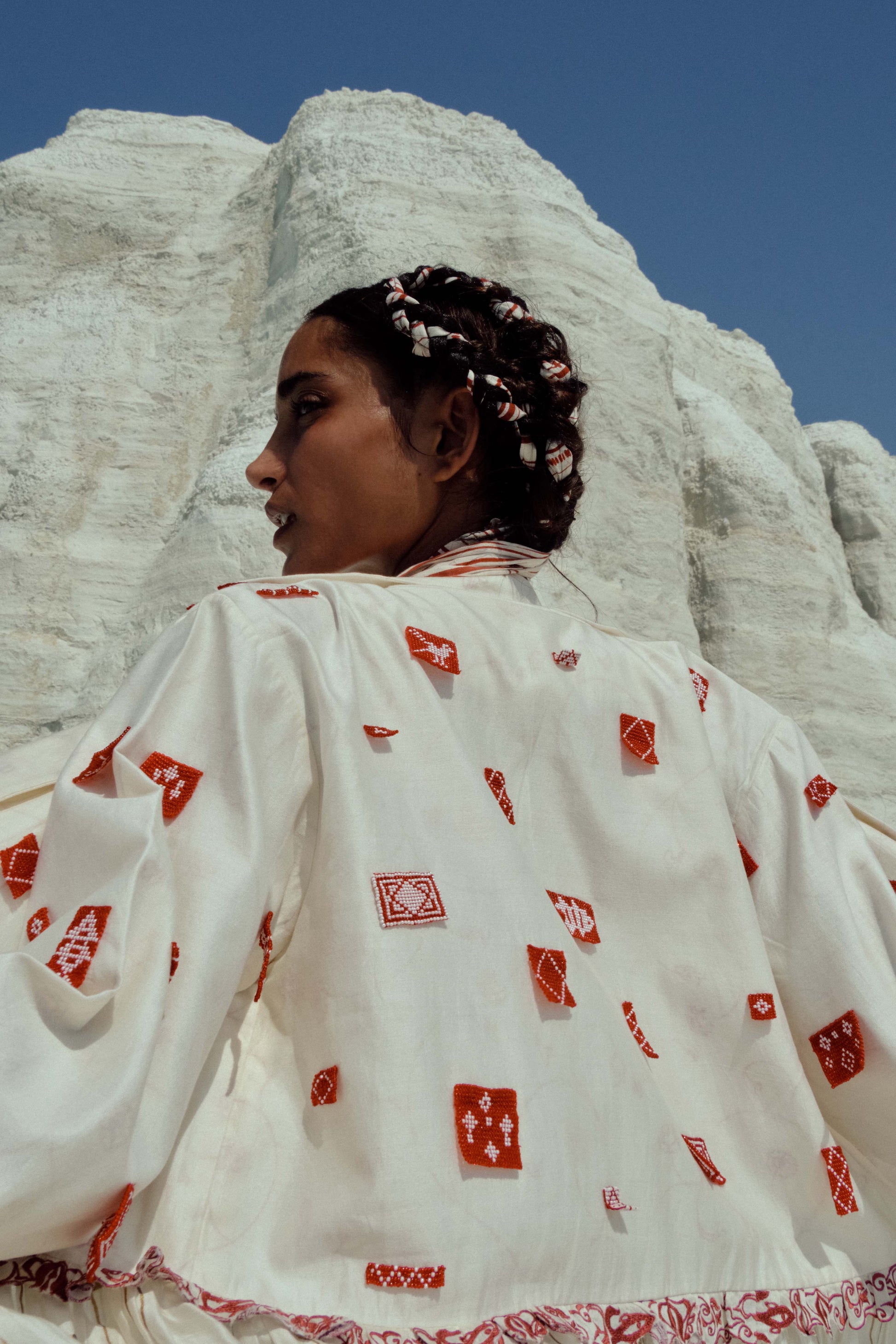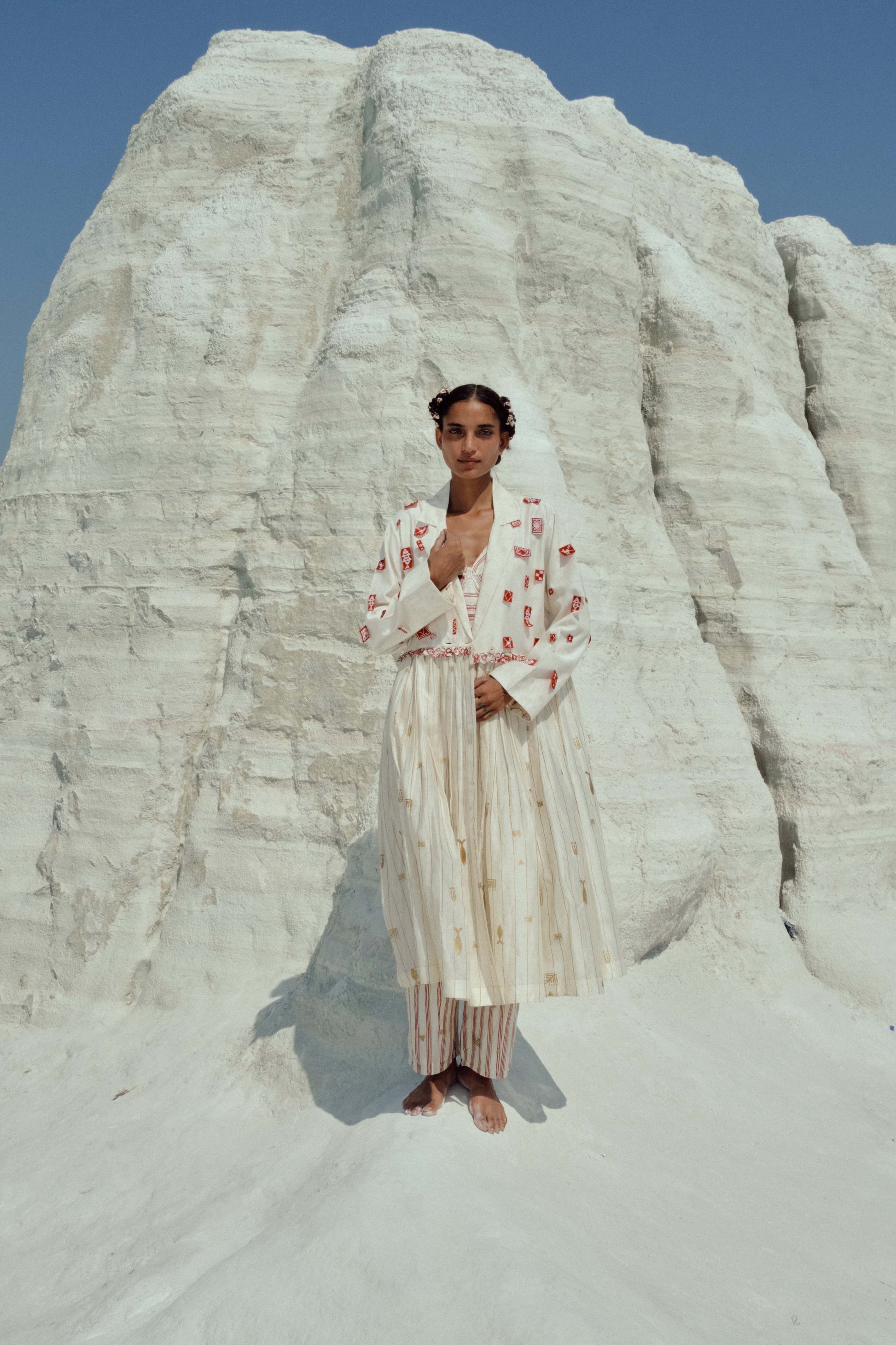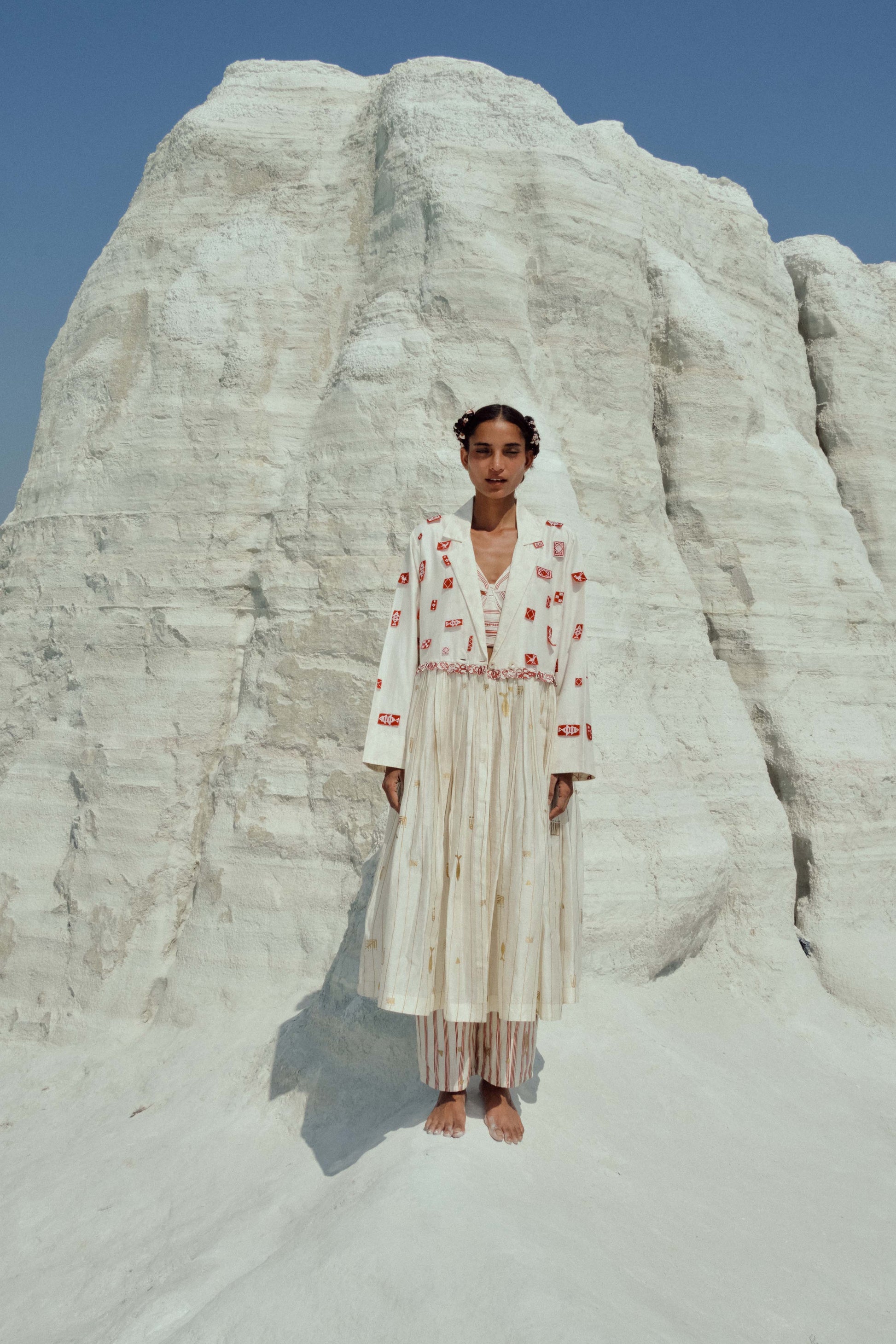 The Shin Long Jacket is crafted from hand-screen-printed cotton silk and cotton, a harmonious blend of texture and structure. Intricate hand-beaded patches adorn body, each reflecting hours of dedicated artisan labour. Light gathers at the waist provide subtle movement, while delicate hand-embroidered lace tracing the seams adds femininity to the tailored silhouette. Designed with a balance of strength and softness, this jacket flows gracefully over the body, embodying refined elegance and the quiet poetry of meticulous craftsmanship.