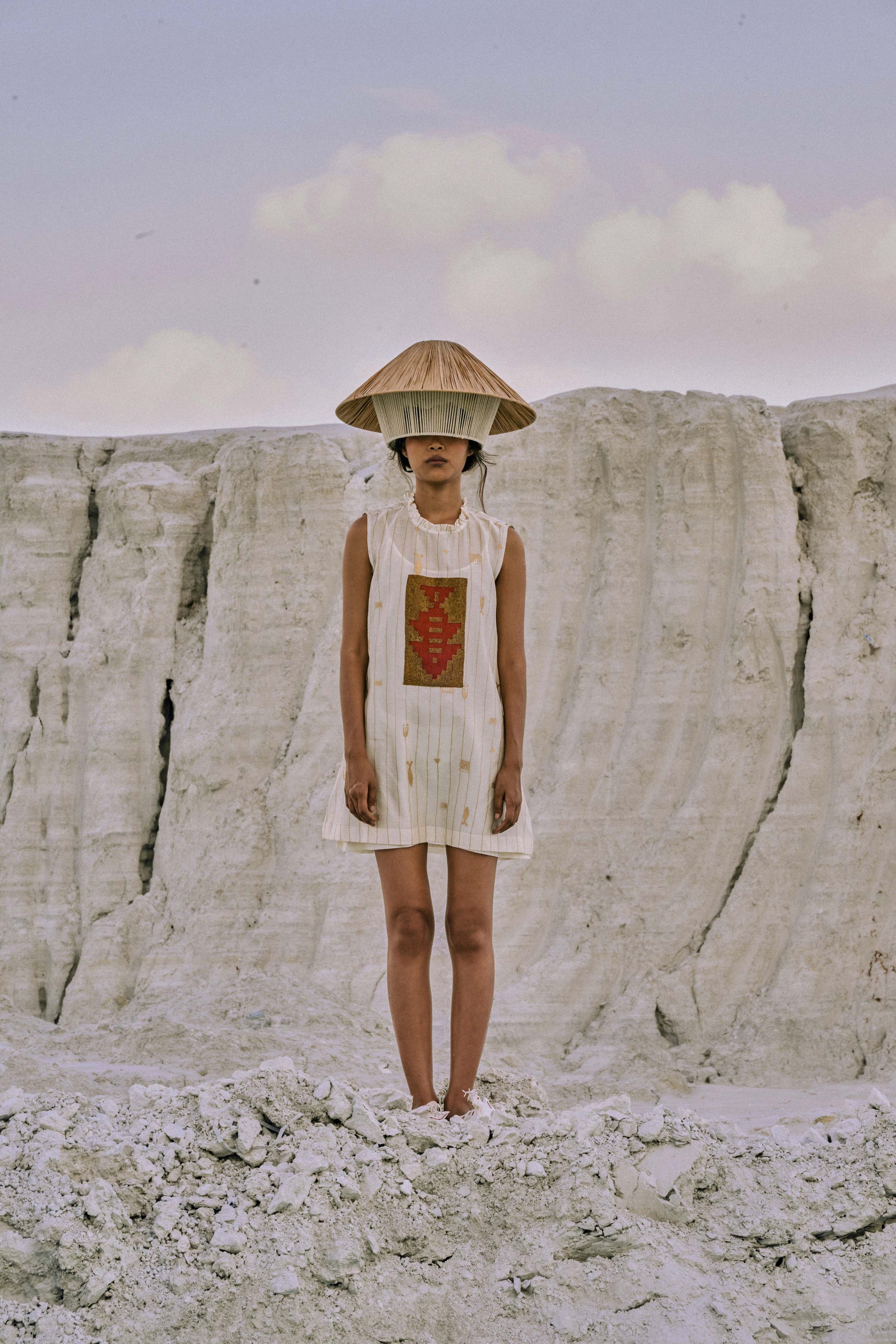 Bold and effortlessly chic, the Solara Shift Dress is crafted in hand-screen-printed cotton silk. . The centrepiece—a hand-beaded patch—reflects hours of meticulous craftsmanship. Its boat neckline features gentle gathers, while a back tie-up with handmade beaded tassels ensures a perfect, adjustable fit. A loose hem falls slightly above the knee, adding lightness to the silhouette. Every element, from stitch to embellishment, embodies the quiet elegance of artisanal labour, making this dress both a statement piece and a refined casual essential.